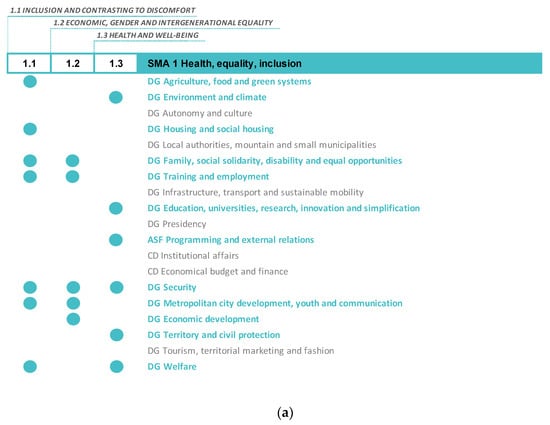 From the literary review on Scopus, Web of Science and Google Scholar, precedent studies highlighted that despite occasional reference to the SDGs in strategic and operational plans, there is a lack of explicit sustainability programs that include clear management responsibilities [6]. Many studies refer to the SDGs implementation and policies integration [10]: some introduce the role of local authorities and identify general barriers and opportunities to shape local action for sustainable development, with a focus on municipalities [1,2,5] or on the wider concept of governance for sustainability [3,13]; other research analyzes the extent to which strategic plans encompass the sustainability paradigm [6]; and others apply a strategic management lens to local government sustainability activities, trying to understand positive and negative experiences from the process of SDGs localization [4] and to understand how and when investments in new capabilities are suitable for meeting sustainability goals [7]. Therefore, this literature review allowed the identification of a research gap, since no sources explicitly refer to how local authorities manage sustainable development goals by discussing their internal organizational structure and competencies. Soberón et Al. (2020) proposed an analysis for identifying the sustainability competences attributed to the organizational structure of the Spanish Ministry of Agriculture, Fisheries, Food and Environment (MAPAMA) and for measure, its potential contribution upon each SDG target [11]; however, this study was conducted at the national level, not taking into account the local scale, nor the sub-national sustainability strategies that are the focus of this contribution. On the other hand, Medeiros and van der Zwet (2020) examined the design and implementation process of Integrated Strategies for Sustainable Urban Development (ISUD) at the metropolitan and medium-sized cities levels, highlighting how urban strategies can be strengthened through the creation of “intra/inter-city networks” and the active involvement of citizens and stakeholders. In particular, metropolitan areas seem to have more dedicated and operational urban planning structures with adequate resources (budgets and personnel) compared to medium-sized urban areas [22]; however, the study refers to horizontal governance and networks, instead of vertical governance and internal competencies of different institutional levels (that is the subject of this research). Moreover, Yang and Zhao (2022) analyzed, on the scale of megacities, the effect of different space governance tools and strategies on the spatial evolution of suburban forms, in order to achieve coordinated and sustainable development [23]. Nevertheless, here, governance tools are meant as plans and policies instead of institutions’ structures, responsibilities and capacities.