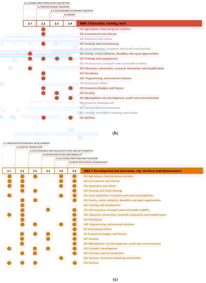 The second phase concerned the comparison among the organizational structures and functions of the local authorities (Section 3.2) by applying the IFMA reading grid. The outcome of the second analysis consists in the identification of the different capacity gaps related to the RSDS implementation. The study refers to the organizational capacity, that means the degree to which the departmental structures (such as sectors and offices) and their staff are in place within the institutions and dialogue to develop and deliver sustainability policies. Implementing sustainability strategies requires a better alignment and coherence between institutional areas of competence and key strategic targets of RSDS. In this sense, the third phase of the study focused on the integration between institutional functions and the RSDS targets (Section 3.3).