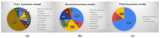 Fifty-five percent (n = 26) of respondents identify with the mutualiser model as their primary business model, followed by eight percent for reduction at the source and logisticians, respectively, and six percent for consultants in circular economy (see
