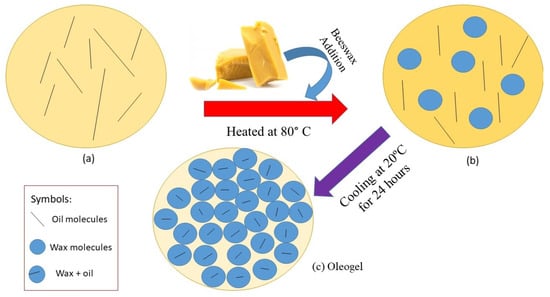 Combining different bio-based materials opens up the possibility of modifying their properties, potentially leading to more efficient products. Since oils present low solidification temperatures and waxes present high melting temperatures, compared to the ambient temperature, the combination of the two results in a material with an intermediate melting temperature. With this prospect, oleogelation was proposed as a feasible method to achieve this. Oleogel is a gel-like material formed by a low concentration (<10%) of an oleogelator, generally wax, and an oil. Using the appropriate gelation method, oleogelator molecules are dispersed in the oil phase and self-assemble to form a network, structuring the liquid oil. The crystalline phase is usually prepared by controlled rapid cooling of a warm liquid oil phase to a temperature well below the melting point of the crystalline phase. The formation of very large crystals is prevented by deep cooling and high cooling rates. This avoids crystallization conditions just below the melting point of the crystalline phase, where supercooling can occur relatively easily because nucleation rates are low and crystal growth rates are large [25,26,27].