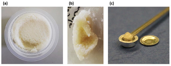 Thermal energy storage (TES) was evaluated by DSC. A heat-flux DSC method, named as a dynamic method, was applied. German codes DIN 51005:2022 [28] and DIN 51007:2019 [29] have been used as a reference to perform DSC tests, whereas IEA standard procedure DSC 4229 PCM Standard [30,31] is followed to determine the heat storage capacity of the PCMs. Detailed information about the calculation of the heat storage capacity can be found in [32]. The test was performed in a NETZSCH, equipment model DSC 214. An alumina crucible (capacity of 40 µL) with a hole in the lid was used. Figure 2 illustrates the preparation of a sample for a DSC test.
