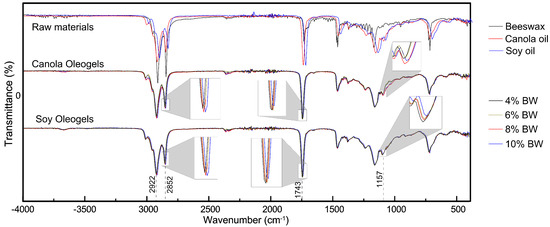 In order to evaluate the chemical structure of the produced oleogels, FTIR analysis was performed. ATR-IR spectra of all samples are presented in Figure 3.