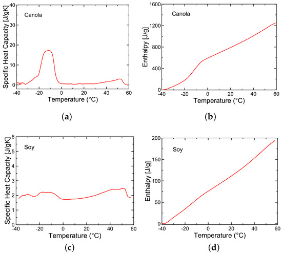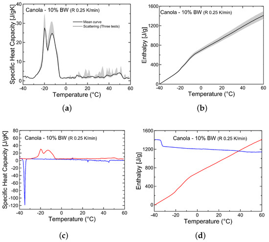 DSC measurements of canola and soybean oleogels with 10% beeswax (BW): canola oleogel specific heat capacity (a) and enthalpy (b); soybean oleogel specific heat capacity (c) and enthalpy (d).