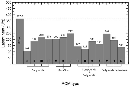 In Figure 5, comparisons with an ample gamma of phase change materials, both organic and inorganic, used for miscellaneous applications, are shown. The range of latent heats was from 100 J/g to 279 J/g, with most being between 180 and 220 J/g, including PCMs for cold storage, with melting temperature under −10 °C [40,44]. As can be seen, BC10 presented latent heat far beyond the other researched PCMs, demonstrating its possible applicability for cold storage in cold chain foods and their preservation.