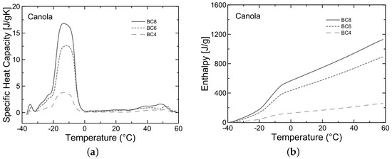 It can be observed in Figure 6 that oleogel BC8 presented the best results of specific heat capacity and enthalpy among the three formulations. An increase in the content of beeswax increased the heat storage capacity of the materials, however, BC4 and BC6 presented a greater increment in heat storage capacity compared to BC8. Although it would seemingly be more efficient to add more than 10% beeswax to the oleogel, studies in this field [58,59,60,61,62] have already demonstrated the unfeasibility of doing so.