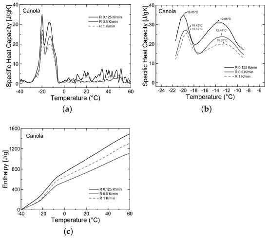 Figure 7 shows the curves of each sample at different heating rates (0.125, 0.5, and 1 K/min) along with specific heat capacity and enthalpy (latent only). A significant difference can be observed among each sample with different heating rates. The melting temperature (Tm) presented a high and defined peak in the sample with a heating rate of 0.125 K/min. Other authors [32,68,69,70] realized that different DSC heating rates (latent only) in PCMs can influence the DSC curves during melting, and lower heating rates result in a higher specific heat capacity of the materials. For the two (local) peaks of heating rates, more pronounced at 0.125 K/min, the first peak (also maximum) was registered at −20 °C, and the second local peak was achieved at −12 °C. The two major melting curves can be associated with the polymorphism of natural oils and fats. A similar observation was found by [71] in different types of oils.