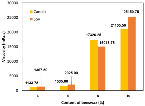 The results of the viscosity of the oleogels obtained at 20 °C are shown in Figure 9, where we can observe three effects of the formulation: they presented a higher viscosity with a greater content of beeswax; there has been a difference in viscosity results between canola and soybean oils, being more discernible when the content of beeswax increases; increasing from 6 to 8% beeswax caused a significant increase in viscosity for both oleogels.