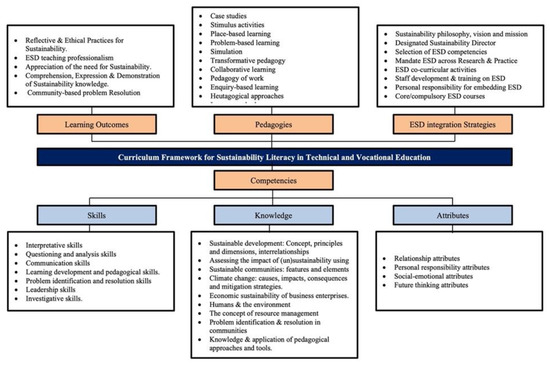 These issues and challenges further reiterate one major problem, i.e., the need for a curriculum framework that accounts for important ESD elements that TVET teacher training institutions must embed into their curriculum to train pre-service vocational teachers at the undergraduate level. Regardless of the many frameworks and models of sustainability, these frameworks need to define specific ESD standards and elements that must be embedded into the curriculum of TVET teacher training programmes across HEIs. Cebrián and Junyent [20] argue that existing ESD frameworks must become alive and integrated into the existing teacher training curriculum to facilitate the development of ESD competencies among pre-service teachers. Given the absence of such a holistic curriculum framework for sustainability literacy in technical and vocational teacher education, we proposed an exemplary curriculum framework for sustainability literacy that reflects the viewpoints of sustainability experts in the Asian-Pacific region. We do this by consolidating the viewpoints of sustainability experts into important ESD elements that must be accounted for in the curriculum of TVET teacher training programmes to develop sustainability-literate vocational teachers who would, in turn, contribute to the training of more sustainability-literate workers and graduates, thereby enabling the development of a sustainability-literate citizenry and workforce. This research contributes to the existing literature by providing an exemplary curriculum framework that defines key elements of ESD, reflecting the key competencies that vocational pre-service teachers must develop to successfully design lessons within their subjects.