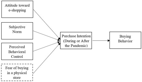 A study by [25] focusing on the adoption of e-banking has shown that the extended TPB model predicts intention better than the basic model. Taking this stream of research, we seek to sufficiently understand and predict consumers’ intent to make online purchases. It’s also intriguing to see how the theory relates to e-shopping during the global pandemic crisis. Thus, the current study employs the main components of the planned behavior theory [14]—attitudes toward online shopping, subjective norm, and perceived behavioral control—and the fear of shopping in a physical store. According to [26] (p. 2), the later factor is “a potential conditional factor that impact on purchase behavior, especially during the COVID-19 pandemic”. In the present study, the dependent variables are the intention to shop online during and after the pandemic and the actual online behavior. The present study extends the literature on the theory of planned behavior to the understanding of online shopping by showing that amid a pandemic the factor “fear of shopping at a physical store” is very important for providers and consumers. Additionally, the outcomes of this research can be helpful for sale managers and executives as it provides a framework of customer behavior during pandemic (present or future).