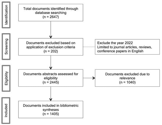 The PRISMA (Preferred Reporting Items of Systematic Reviews and Meta-Analyses) was adopted [28] to guide the search for documents, and the steps are shown in Figure 1. The keywords mentioned above were searched in the Scopus database, which yielded 2647 documents. The types of documents were limited to journal articles, reviews, and conference papers in the English language. The review duration is from 1975 (i.e., the first publication in the study field) to the end of 2021.