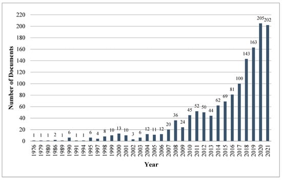 A total of 1405 Scopus-indexed publications were found between 1976 and 2021, showing a significant accumulation of documentation in this field. Figure 2 presents the evolution of publications. The literature slowly grew before 2007, with yearly publications below 20 documents. After that, the annual publication growth rate increased to 4%, and the growth of eHealth literature in Southeast Asia took off in 2018 with a yearly publication growth rate of 13%. The number of publications between 2018 and 2021 accounted for over 50% of the total publications. These findings show the rapidly growing literature in the last four years. The increase in scholarly interest in eHealth in Southeast Asia countries could be due to the development of digital technologies [32], high-speed Internet, and mobile phone technologies in this region [33]. Recent public disease outbreaks (COVID-19) also accelerated the growth of eHealth literature in the Southeast Asian area [16,17,18,19].