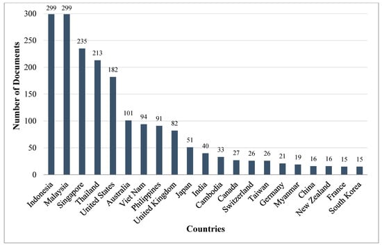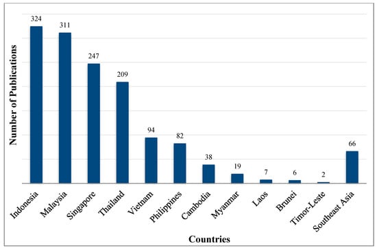 The data trend in Figure 3 shows that the field was interested in by scholars worldwide. The top authorship countries were Indonesia (299 documents), Malaysia (299 documents), Singapore (235 documents), Thailand (213 documents), and the United States (182 documents). The combination of publications from scholars in these five countries accounted for more than 50% of the total publications in the Scopus-indexed knowledge base. The publications were categorized based on the location of the research (Figure 4). It confirms that eHealth in Southeast Asia research was conducted mainly in Indonesia, Malaysia, Singapore, and Thailand. According to Erh (2021), these four countries have a highly developed digital economy in Southeast Asia [33]. On the contrary, several published research carried out in Laos, Brunei, and Timor-Leste were notably low.