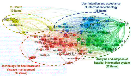 The blue cluster studies “the user intention and acceptance of information technology”, included scholars such as Davis, Venkatesh, Ajzen, Agarwal, and Fishbein [74,75,76,77,78]. These scholars were linked because their research examines individual users’ attitudes, perceptions, and acceptance of IT adoption. Davis and Venkatesh, located in this cluster, were the top two co-cited authors in Table 3. Davis is the pioneer in developing the user acceptance of technology theory [76]. Venkatech collaborated with Davis and colleagues to build the UTAUT model, which is very useful for scholars, policymakers, and technology developers to determine the user acceptance of IT [78]. The findings of the top-cited document in this study also suggested that the UTAUT model could be applied to health technology in Thailand [35].