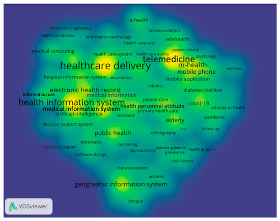 Figure 6 shows the density map of the most frequently occurring keywords in the literature: healthcare delivery (316), telemedicine (308), health information system (243), medical information system (164), m-health (162), electronic health record (141), geographical information system (135), public health (124), hospital (120), elderly (115), organization and management (105), and covid-19 (100). These frequently occurring keywords offer insight into the subjects of studies that describe the eHealth in Southeast Asia knowledge base since its emergence in the past four decades.
