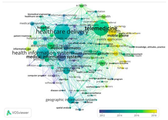 The biggest bubbles, such as “healthcare delivery”, “telemedicine”, “health information system”, have darker colors, meaning that they were popular keywords in the earlier periods. However, this temporal co-word map also presents recent topics in the eHealth literature. The term “m-Health” is shown in the lighter bubble, and it is a relatively new topic emerging after the year 2018. Recent topics of interest among scholars are keywords such as “mobile application”, “social network”, “covid-19”, “pandemic”, “patient referral”, “follow up”, “self-care”, “quality of life”, “psychology”, “diabetes mellitus”, and “hypertension”. These findings, thus, confirm that the recent public health outbreak, the COVID-19 pandemic, accelerated the usage and application of new health technology in Southeast Asia, especially mobile health technology.
