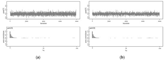 After determining the prior distribution of the above SEM and related parameters, the urban macro traffic datasets of Guangzhou and Beijing are analyzed by Openbugs. The parametric trajectory diagram and autocorrelation graph of in Guangzhou and Beijing in a randomly selected replication are presented in Figure 2 to reveal the convergence. It can be seen from these plots that the Openbugs program iterated 8000 times and converged in 4000 iterations. In this study, 4000 observations were collected after convergence to yield estimates and their standard errors.