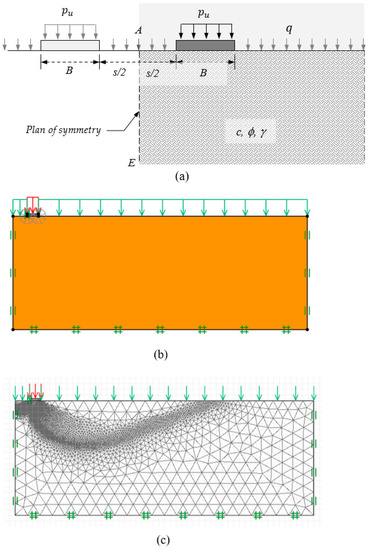 The first problem considered here was for two interfering footings. Each footing had the same width (B) and was subjected to a limit vertical pressure of pu (i.e., the bearing capacity of the footing). As shown in Figure 1a, the edge-to-edge distance of the two interfering footings was defined as s. The surcharge pressure was denoted by q. The line of symmetry in the middle of the domain was indicated by a dashed line (AE). Owing to the problem’s symmetry, the simulation utilized just half of the domain, and the symmetrical boundary condition (the left boundary) only required the nodes to move vertically (Figure 1b). At the right boundary (or the far side), the same condition was applied. The bottom border was restricted with no movement allowed in both directions, while the upper boundary was unrestricted.