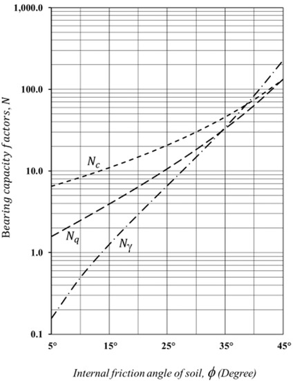 Variation in the bearing capacity factors Nc, Nq, and Nγ.