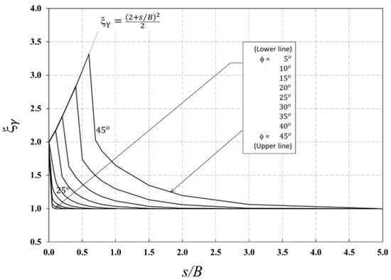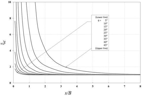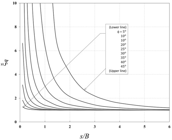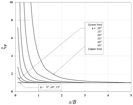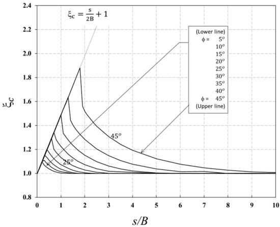 The efficiency factors are functions of the soil’s internal friction angle (ϕ) and the spacing ratio (s/B), as expressed in Equation (5).