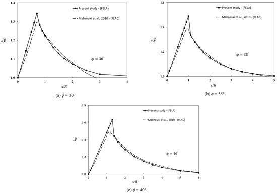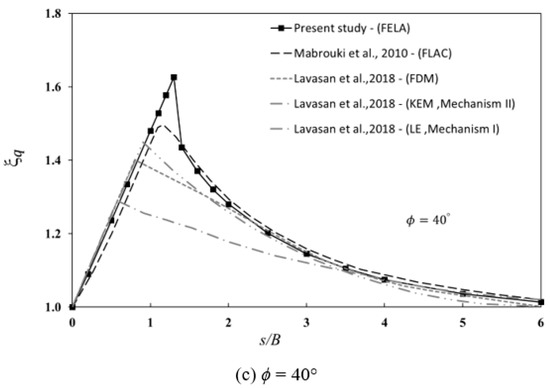 Figure 7a–c show the comparisons of ξc for the different values of ϕ = 30°, 35°, and 40°. In general, the finite difference results (FDM) presented by Mabroukei et al. [6] are in good agreement with the present FELA results. It is interesting to note that those produced by FDM could not reach the peak values of the current FELA. This resulted in some differences, as shown in Figure 7a–c.