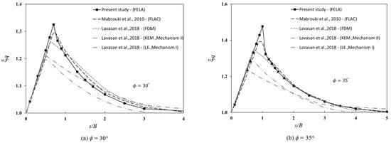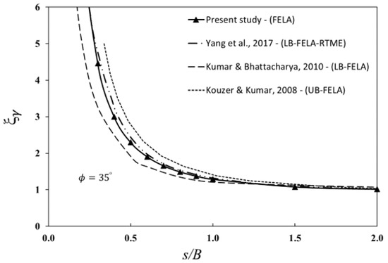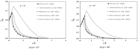 Numerical comparisons of ξq for different values of ϕ (30°, 35°, and 40°) are presented in Figure 8a–c. In Figure 8a, for ϕ = 30°, the finite difference results (FDM) of Mabroukei et al. [6] were in good agreement with the present FELA results. Nevertheless, those reported by the limit equilibrium and the upper-bound methods were well under the agreed curve, and the results cannot be used in practice. As ϕ increased, the differences became greater (see Figure 8b,c for ϕ = 35° and 40°, respectively). Finally, comparisons of the efficiency factor ξγ for ϕ = 35° and 40° were made with those published by Mabrouki et al. [6], Kumar and Kouzer [5], Schmüdderich et al. [33], and Kumar and Ghost [3], and they are shown in Figure 9. The numerical results showed that the present solutions agreed well with all other published solutions at larger s/B ratios. The results of Kumar and Ghost [3] with mechanism IV are considered to be over-conservative, as they were consistently higher than ours. It should be noted that this is the first study to employ FELA with an adaptive mesh refinement to compute rigorous bound solutions. As indicated by several researchers (e.g., [19,20,21,22,23,24,25,26,27,28]) who also used the feature of adaptive mesh refinement, the differences between the LB and UB solutions became neglectable, which led to more accurate limit state solutions of several stability problems.