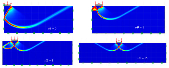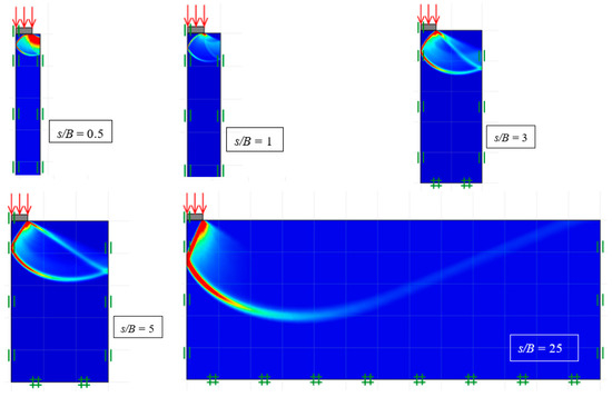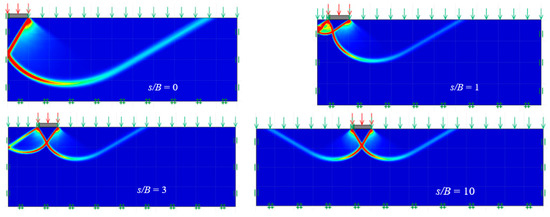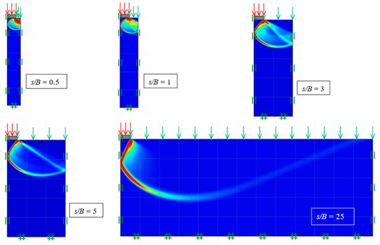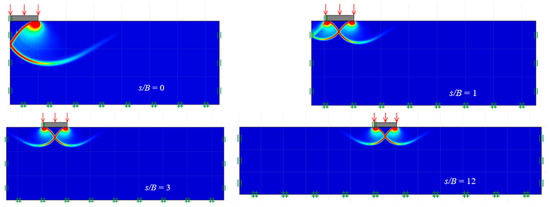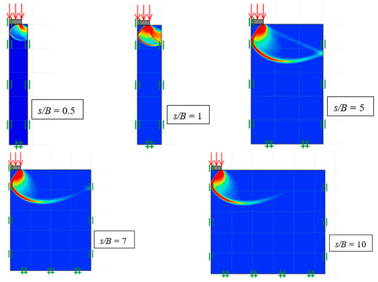 The failure mechanisms for ξc (c ≠ 0, γ = q = 0), ξq (q ≠ 0, c = γ = 0), and ξγ (γ ≠ 0, c = q = 0) are presented in Figure 10, Figure 11 and Figure 12. The plots are for ϕ = 30°. For brevity, only the plots of shear dissipation contours for the various distance ratios (s/B) are shown. When s/B = 0, the problem of two footings turns into a single footing, where the failure is in a Prandtl-type pattern. Noting the symmetrical domains in the figures, the overlapping effects were particularly noticeable at minimal s/B values. This overlapping action may improve the capacity of the footing, but the downside would be the possible uneven footing settlement. On the other hand, as expected, the larger the s/B ratio, the smaller the footing interference. Prandtl-type failure mechanisms were obtained for large values of s/B, as can be seen in Figure 10, Figure 11 and Figure 12.