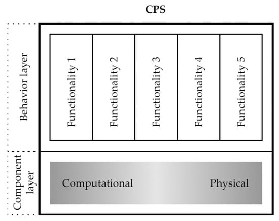 Figure 5 shows a schematic structure of a CPS, which includes a component layer and a behavior layer. “CPS are engineered systems that are built from, and depend upon, the seamless integration of computation and physical components” [38]. Therefore, the component layer consists of a single element that outlines this seamless integration with a gradient. In this scheme, there is no need to further disaggregate the components because for our consideration, the focus is on the behavior of CPS. It is precisely this behavior that is outlined in the behavior layer. The elements in this layer represent the functionalities of the CPS. Depending on the complexity, the number of functionalities of a CPS varies. We have sketched five functionalities as examples in Figure 5. This representation is on an abstract level in which we aim to show the encapsulation of functionalities. These may be basic functionalities to operate the CPS or functionalities to fulfill the mission or purpose of the CPS. In the following, we take a closer look at the behavior layer and these functionalities in terms of their autonomy.