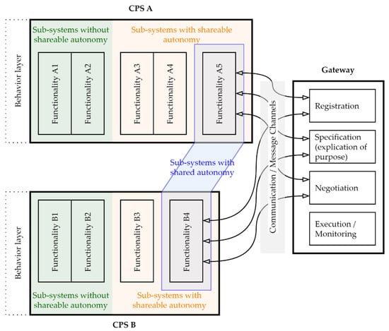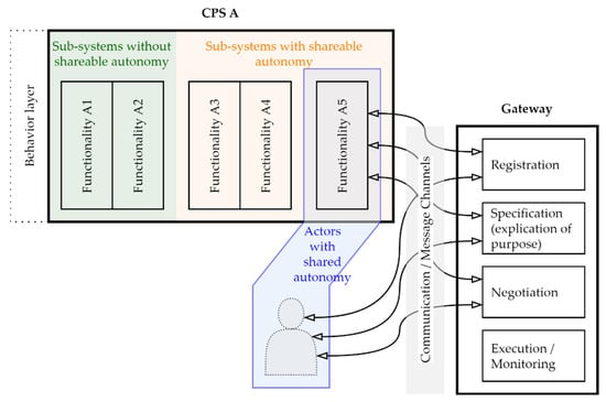 Figure 5, Figure 6, Figure 7 and Figure 8 outline the schematic structure of autonomous CPS. Moreover, in these figures, we illustrate shared autonomy (or sharing of autonomy), which can change dynamically during runtime, at the behavioral layer. We next present an architecture for this abstract concept that shows the way in which the sharing capabilities work. It is essentially based on the system-of-systems concept and introduces a gateway component that serves as an intermediate control entity. This gateway component has codified the purpose of sharing and is able to negotiate before executing and monitoring a particular CPS. Figure 9 outlines the concept including the gateway, the two autonomy-sharing CPS, and the required communication or message channels between the CPS and the gateway. The socio-technical context requires that the concept also works with human actors (see Figure 10). For example, they could be involved via a graphical user interface (e.g., via a smartphone app) or via another CPS with the ability to interact (e.g., via buttons).