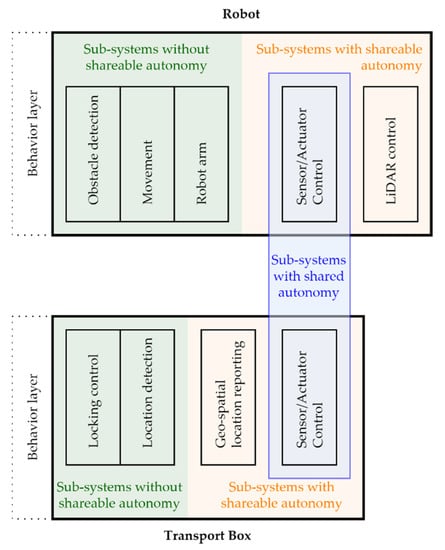 Figure 11 illustrates the scenario focused on the sub-systems of the robot. LiDAR (Light Detection And Ranging) control and sensors/actuators control have shareable autonomy, while the robot arm, movement, and obstacle detection have no shareable autonomy. LiDAR and sensors/actuators are thus basically controlled by the robot; however, they could also be controlled by another subsystem within the smart logistics system.
