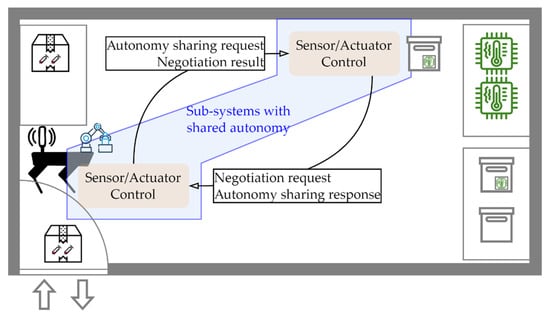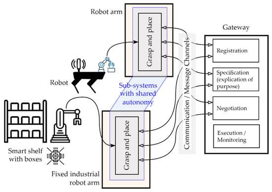 We can now apply our concept to the smart logistics system. Figure 13 depicts the robot and the smart transport box as well as the sub-systems with the capability to share their autonomy. According to our concept, the gateway takes over the process of sharing autonomy of these sub-systems. The capabilities of the gateway can either be integrated into each sub-system or operated as a separate system.