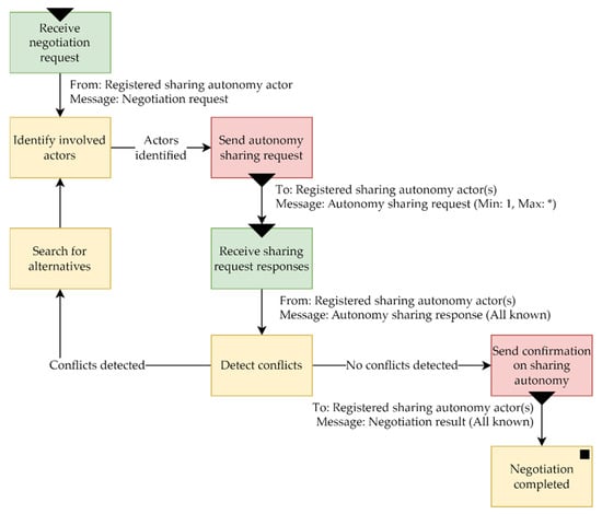 The SBD of the subject that encapsulates the negotiation is shown in Figure 15. Green boxes are so-called “Receive states” that receive messages from other subjects, yellow boxes represent “Function states” that perform actions, and red boxes stand for “Send states” that send messages to other subjects. When a negotiation request from another actor sharing autonomy is received, all involved actors are identified. In our case, that might be only two sub-systems: the sensor/actuator control sub-system of the robot and of the smart transport box. The next step is to send an autonomy-sharing request to all identified (and registered) actors who are capable of sharing autonomy. After responses are received, conflicts will have to be detected. If no conflicts are detected, a respective confirmation is sent to all involved actors and the negotiation is completed. If conflicts are detected, such as one subsystem being unwilling or unable to share autonomy, the subject searches for alternatives and starts over, thus having to identify and contact the actors involved again, and so on. The selected level of abstraction allows humans to continuously design and control the behavior of a CPS. Therefore, the algorithm represented by the SBD is the codification of sustainability intelligence. It is at disposition for dynamic adaptation and execution, since either humans or technology can be assigned to implement the specified activities.