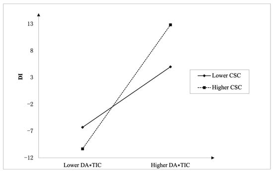 According to the random effect estimation results of model 3 and model 4, the two interaction terms DATAC ∗ CSC and DATIC ∗ CSC had significant positive effects on digital innovation. Meanwhile, R2 of model (3) rose from 0.1237 in model 1 to 0.1310, and R2 of model (4) rose from 0.1290 in model (2) to 0.1560 of model (4). This shows that the moderating effect of social capital is established. That is, the stronger the corporate social capital is, the stronger the positive impact of the synergy of digital capabilities and technological capabilities on corporate digital innovation will be. Therefore, Hypothesis 3 and Hypothesis 4 are proved.