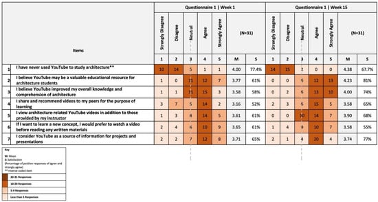 Over 61% of students considered video-based materials to be a beneficial learning tool in the history of architecture course at the beginning of the semester (item 2), and yet this percentage increased considerably to 81% by the end of the semester. At the end of the semester, a significant proportion of students (74%) believed they had gained more knowledge and enhanced their learning as a result of using video learning resources (item 3).
