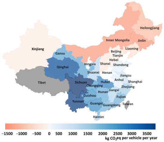To sum up, the national average C2G GHG emissions of BEVs are higher than ICEVs, but for some provinces and cities, especially regions with cold winters and a dependence on coal power, replacing ICEVs with BEVs might even increase GHG emissions. The GHG emission reduction effect of replacing ICEVs with BEV300s of long electric ranges is insignificant (5% reduction of GHGs on national average), while BEV100s of short electric range can reduce C2G GHG emissions by 22% compared to the conventional ICEV. However, BEVs with longer electric ranges are preferred by consumers for reducing range anxiety. In 2018, 64% of BEVs sold in China had electric ranges greater than 300 km [62]. Under the market trend of increasing electric ranges of BEVs, further improvement of battery technology and measures to clean the electricity grid are required to achieve the GHG emissions reduction goal by vehicle electrification in China.