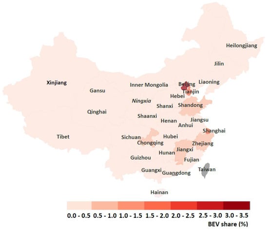 BEV share of light-duty passenger vehicle stock by province in baseline year 2017. Data source of light-duty passenger vehicle stock by province: [12,15].