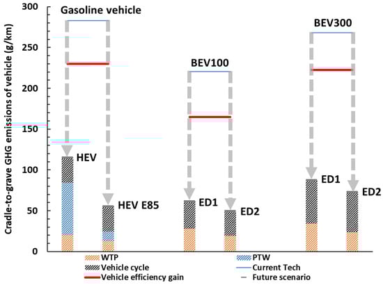 Compared to gasoline ICEVs, BEVs are powered by electricity and require additional electricity in vehicle manufacturing to produce batteries and other electric components, thus the C2G emission level of BEVs is significantly affected by the embedded emissions intensity of electricity. Replacing GHG-intensive fossil fuels, such as coal, with renewable energy, such as solar and wind, for power generation is the pathway for electricity decarbonization and reducing C2G emissions of BEVs. In the study, we analyzed the potential changes in C2G GHG emissions of BEVs under two scenarios of electricity decarbonization (ED). In ED1, 91% of the electricity is generated from renewable and nuclear energy, 3% from natural gas, and 6% from coal power with carbon capture and storage (CCS) equipment installed [1,2]. In ED2, 96% of the electricity is sourced from renewable and nuclear energy, and the rest is derived from natural gas [65]. Both ED1 and ED2 scenarios are considered to meet the mitigation target of 1.5 °C temperature control [1,2,65]. On the basis of vehicle efficiency improvement, the ED1 scenario leads to a 63% and 61% decrease in C2G emissions for BEV100 and BEV300, respectively, and 70% and 67% reduction in C2G emissions for BEV100 and BEV300 are expected in ED2 scenario, respectively. See Tables S5 and S6 in Supplementary Materials for details about the assumptions of future scenarios.
