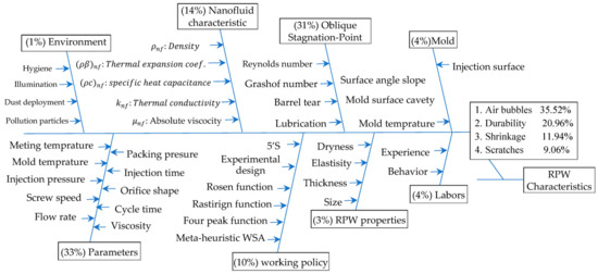 The primary purpose of this work is to test the efficiency of enhancing the RPW forming in molding by mixing it with MHD fluid containing nano particles of β(core) and β(skin) into a nanoliquid solution to enhance the viscosity and reducing the empty particles. The parts are segregated based on different defects shown in Table 1 for other injection molding processes to stand over the cause of the defect, as illustrated in Figure 1. The Fishbone diagram for a product that represents the highest number of total defects as discussed in the Pareto chart and illustrated in Figure 2. The air bubbles caused due to failure in setting injection time, suction process, lack of parameters setting, and other significant factors such as tackling methodology and tracking the oblique Stagnation-Point Flow [,,,]. The authors investigated the convective flow caused by hybrid MHD flow along the slip effect by considering the over-Riga die surface. Some researchers examined the combined convective flow near an SP and offered double solutions in the presence of liquid solution-based binary hybrid nanoparticles via an over-vertical Riga die surface []. The dynamics of mass and energy transfer in a micro rotational flow with mixed convection and suction/injection across an over-Riga die surface were recently examined by Rafique et al. []. They demonstrated that the modified Hartmann parameter causes the fluid’s velocity to develop. To deal with the RPW in production, its properties must be improved by mixing it with nanomaterials via nanofluid. The mixture is pressured in an incubator device that is fixed to the desktop injection machine. The incubator consists of three pistons and a Riga plate installed inside the incubator to absorb the nanomaterials, push it into the molten plastic, and then pump the mixture with the third piston towards the die. It is suggested to use a WSA to adjust the operating parameters to ensure a good blend. The WSA hybridizes with RSM to elect the significant working parameters and set their values, which are checked by DOE mathematically. The two main successive phases are manipulated through IFM methodology to understand the relationship between material properties and working parameters.