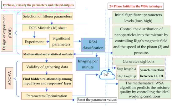 The experiment begins by choosing the critical operational parameters, which were divided into categories by (RSM) demonstrated by (DOE) in front propagation and predicting the deviation in nanoparticle feeding brought on by a Lorentz effect, as discussed in Figure 6 above. A homogeneous transverse gravitational flux has highly conductive nanomaterials through a vertical porous die into a porous substance (i.e., part 9 in Figure 3) with time-dependent oscillatory permeability. Some of the mathematical equations feed a meta-heuristic technique called the weighted superposition attraction algorithm (WSA) in the backpropagation to reset the significant parameters to keep the product within standard specifications.