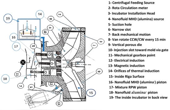 The authors study the physical properties of the mixture and adjust the operating parameters that qualify it to provide good plastic products. The mechanism is done over three steps as shown in Figure 6, which depicts a schematic prototype injection machine diagram (front view). The mechanism of the flow is illustrated in Figure 6 (i.e., mix MHD and RPW) and Figure 7 (i.e., mixture pushing in the cylinder toward die). The Riga plate adheres to two coaxial triangular pieces to combat the air bubbles’ path. The external incubator has a jacket-like design and is triangular in shape, measuring 23 × 23 × 23 cm. It is made of a translucent stainless sheet that is 0.15 cm thick. Using translucent 18 × 18 cm stainless, a section of the base was created to make it simpler to observe the vane-setting angle. The inner cistern is a 12 cm by 12 cm by 23 cm stainless sheet connected coaxially with the inner cistern’s diameter. According to our assurances, the new research is novel, will significantly influence the fields of mathematics and engineering, and will be interesting to other researchers. Therefore, the authors concentrate on capturing and controlling the passage of air bubbles by first detecting their path and stagnation point when mixing using the aided device illustrated in Figure 4. As a result, the researcher is interested in categorizing and determining its pushing impact on air in the center chamber in a steady-state condition [,,]. In order to improve the robustness of air bubbles detection in injection machine processes, it recommended (detecting air bubbles paths).