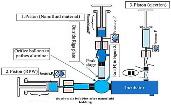 The considerable stream rate turns out to be caused by rotor-stator contact in the incubator appearing in parts (2, 8) in Figure 3 based on two-code pumps. To regulate the variations, the research recommends creating inventive injection machines and modifying several key variables. This flow type is analyzed mathematically by multiplying the orthogonal stagnation-point flow by the shear factor of the flow against facing a surface [,,] as several engineers and academics have researched the 2D constant flow of a Newtonian liquid near an OSPF. Lok et al. [] observed the constant viscous fluid flow through a stretchable sheet approaching a non-orthogonal stagnation point (NOSP). Therefore, the authors inserted part (14) in the piston path and noticed that tangential and Hiemenz components separate the stream function in mixture behavior in an incubator, as illustrated in Figure 7 for piston (1, 3) and Figure 8 for piston (2). Using a stretchy balloon, we studied how buoyancy force affected the NOSP flow in a micro-polar fluid. The effects of suction on an unsteady flow at an oblique stagnation point caused by MHD via a mimicking Nadeem et al. [] similar mechanism over a sheet. Over a shrinkable/stretchable sheet, Li et al. [] achieved twofold solutions of oblique stagnation-point flow in the presence of MHD subject to Cattaneo-Christov flux. is a Cartesian synchronizes or coordinates used to limit the model’s current flow configuration, where the upward and normal axes of the positive and are correspondingly extended along the plate surface. The flow is constrained to the planes and the axis synchronization is assumed to be transverse to the positive corresponding plane. According to theory, the slip velocity at Riga’s wall surface is expressed by . Moreover, the free stream or ambient field of inviscid fluid impinges obliquely on the Riga surface with a controlled velocity discussed in the second phase by , where while . It also, and express the constant wall surface and ambient temperature of the nanofluid, respectively. However, the contrary pattern will happen if the Riga surface is cooled (opposing flow) below the free-stream/far-field temperature . Then the second phase of IFM methodology interested in the control of nanoparticles amount fed to the RPW through control heat and cold case, respectively []. These expectations are the main motivation to enhance the RPW and make it easy to form with minimum defects and distribute the nanoparticles as illustrated in Figure 9, especially if following the Boussinesq approximation and deriving the steady of viscous equations to control OSPSF, which is considered one of the leading causes of defects discussed in Figure 1.