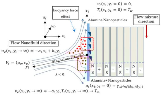 The experiment records eleven defect opportunities in the product during the machining process, as discussed in Table 1 above. The investigation identifies the root cause of process failure by failing to manage the oblique stagnation-point slip flow (OSPSF) of an MHD in two dimensions with buoyancy force over a vertical Riga surface (i.e., part 15 in Figure 3) as illustrated in Figure 10. Therefore, the authors’ check of injection flow parameters and heat transfer properties are also examined [].