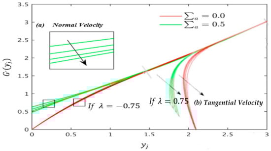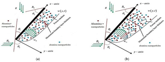 where the and signify the components of solid displacement and velocity in the directions of and , respectively. Additional mathematical notations or symbols are demarcated as the pressure of the nanofluid, the applied current density in the electrodes, the temperature of the nanofluid, the magnetization of the permanent magnets and the respective width of the electrodes and magnets.