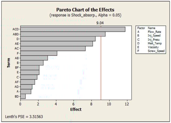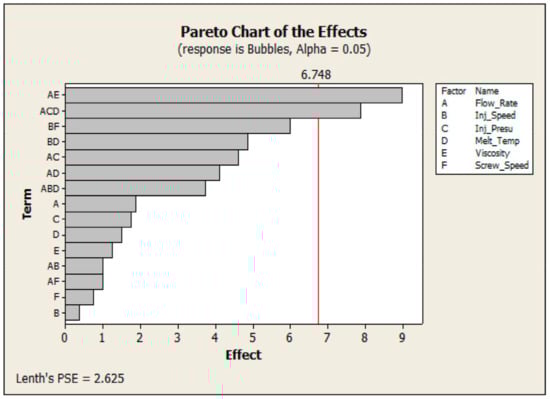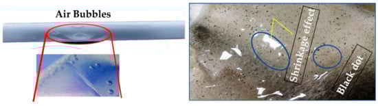 Figure 11 illustrates the effect of flow rate and viscosity and the effect of melting temperature and injection pressure, which must be controlled to resist the bubbles’ appears, while the injection speed causes the shock absorption-dot defects as illustrated in Figure 12 according to effect three significant parameters Flow-rate, Injection-speed, and temperature, which are related to screw speed, and injection pressure also an effect of melt-temperature have a direct impact on reducing the burning shock absorption-weakness defect.