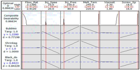 The injection speed [F = 7.45] and screw speed [F = 6.1] have given significant consequences to the defects rate and up melt temperature having the highest significant value esteems that is 20.45% tracked by ambient temperature, while flow rate share, injection pressure, and viscosity 11.17%, 13.89%,15.6%, 11.3% respectively as the influence factor for defects’ reduction. Figure 24 illustrates the optimal working parameters that guarantee to prevent of the three famous defects types with the efficiency of approximately 77.2%, 100%, and 84.23% respectively, while Figure 25 illustrates the durability of the three main famous recycled and notes that the higher the dimensions and the lower the thickness, the lower the durability, but all defects aforementioned in Table 1 are treated. Remaining analysis data can be found in the Supplementary Materials Section.