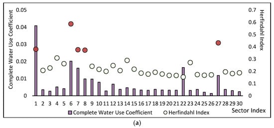 As can be observed in Figure 12a, the Herfindahl index values for the food and tobacco (6), agriculture (1), textile (7), apparel leather (8), woodworking and furniture (9), and restaurant and accommodation (27) sectors are significantly higher than those of other sectors. Among them, the water-use coefficients of the agriculture (1), food and tobacco (6), textile (7) and accommodation (27) sectors are also at relatively high level. This means that, on the one hand, the above sectors have low water efficiency and receive less economic return per unit of water used. On the other hand, they have intensive sources of intermediate inputs and high vulnerability. In addition, combined with Figure 4 and Figure 9, the tendency that the sectors with high Herfindahl index have few input sources is more evident in the virtual water transfer pattern compared to the virtual water scarcity risk transfer pattern. This indicates that those sectors have high water footprints, requiring high water consumption during the production and trade process, which is also evidenced by the complete water-use coefficients in Figure 12a.