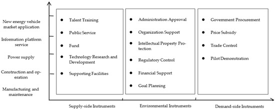 Secondly, the effects of policies are influenced by different stakeholders and, so, the policy maker must consider the operation and integration of all parts of industrial chain regarding the overall layout of policy instruments [24]. According to the different effects of policy instruments, they should be matched with industrial chain parts scientifically and reasonably for sustainable development of the industry. Therefore, as another analysis dimension, the EVCI industrial chain is included in the analysis framework in this paper. The EVCI industry chain can be divided into five parts, namely, manufacturing and maintenance, construction and operation, power supply, information platform service, and new energy vehicle market application. Manufacturing and maintenance includes the manufacturing and production of charging piles and other supporting facilities, as well as their maintenance after putting into operation. Construction and operation mainly includes the investment, construction, and operation of charging stations/piles, where the main body is the charging stations/piles construction operator. Power supply mainly includes the power and energy supply required for the construction and operation of charging stations/piles, and the main body is electric energy enterprises. Information platform service mainly includes building charging service platforms to provide integrated charging station/pile information service for new energy vehicle users, and its main body is the information platform service providers. New energy vehicle market application mainly includes the use of charging infrastructure in the new energy electric vehicle market, such as in private households, the unit and rental passenger car market, and the commercial vehicle market, as well as including public transportation, municipal sanitation, and logistics, in addition to electric vehicle time-sharing rentals.