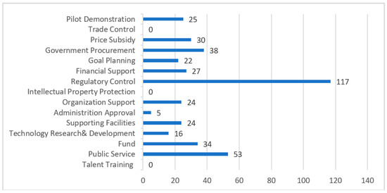 Statistical results of specific policy instruments were obtained by combining the data in Table 4, as shown in Figure 3. In Figure 3, regulatory control was used 117 times: 53 times in public service, 38 times in government procurement, 30 times in price subsidy, 25 times in pilot demonstration, and 5 times in administration approval. Trade control, intellectual property protection, and talent training were all used 0 times, which means that none of these three policy instruments appeared in any of the policy documents. However, the number of regulatory control is 117. This significant difference showed that policy instruments in EVCI policy documents were used unevenly. Meanwhile, it reflects that the Chinese government prefers to use coercive measures to manage the development of charging infrastructure, while neglecting trade control, intellectual property protection, and talent training. Therefore, it is obvious that the use of EVCI policy instruments has excessive, insufficient, or missing problems in different aspects and, so, the distribution is not balanced.