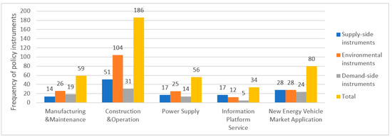 Combining the results shown in Table 4 and Figure 5, it is not difficult to see the following: (1) In terms of manufacturing and maintenance of EVCI, the environmental instruments are the most used, followed by demand-side and supply-side instruments. Specifically, representative instruments mainly include regulatory control and government procurement. (2) In terms of the construction and operation of charging stations/piles, environmental instruments are again the most used, followed by supply-side and, finally, demand-side instruments. Representative instruments mainly include regulatory control, goal planning, and organization support. (3) In terms of the power supply, environmental instruments are also the most used instrument, followed by supply-side and demand-side instruments. Representative instruments mainly include regulatory control, price subsidy, and public service. (4) In terms of information platform service, supply-side instruments are used the most, followed by environmental and demand-side instruments. Representative instruments mainly include public service and regulatory control. (5) In terms of the market application of new energy vehicles, the use ratio of the three types of instruments is relatively balanced. Representative instruments mainly include regulatory control, public service, and government procurement.
