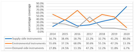As can be seen from Figure 6, the supply-side instruments curve showed an upward trend in 2014–2015. This is related to a policy issued by China in 2014, “The Guidance on accelerating the promotion and application of new energy vehicles”. In this policy, the Chinese government clearly proposed to increase financial support and improve public service by fostering a good market service and application environment. The continued rise in the curve after 2016 is due to the government’s focus on the construction of EVCI and the supply of its public service in subsequent policies. For example, in 2016, “The notice on accelerating the construction of electric vehicle charging infrastructure in residential areas”, which emphasizes on renovation of facilities in existing residential areas and construction of facilities in new residential areas, provided support for the site requirements of EVCI construction. In addition, “The implementation plan for the new national standard for electric vehicle charging infrastructure interface”, which was also released in 2016, called for enhancing the publicity and training of the new national standard, as well as improving the product certification and access management system. This policy provided support for the development of EVCI, in terms of technology research and development.