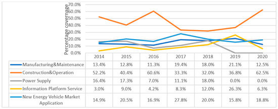 In the EVCI industrial chain, policy relating to charging stations/piles construction and operation occupied the main position, accounting for 44.8%. Market application of new energy vehicles, charging facility manufacturing and maintenance, power supply, and information platform service accounted for 19.3%, 14.2%, 13.5%, and 8.2%, respectively (see Figure 4). This demonstrates that, since 2014, the national policies of EVCI industry have mainly focused on the construction and operation of charging stations/piles and the market application of new energy vehicles, reflecting that China’s EVCI industry is still in the initial development stage.